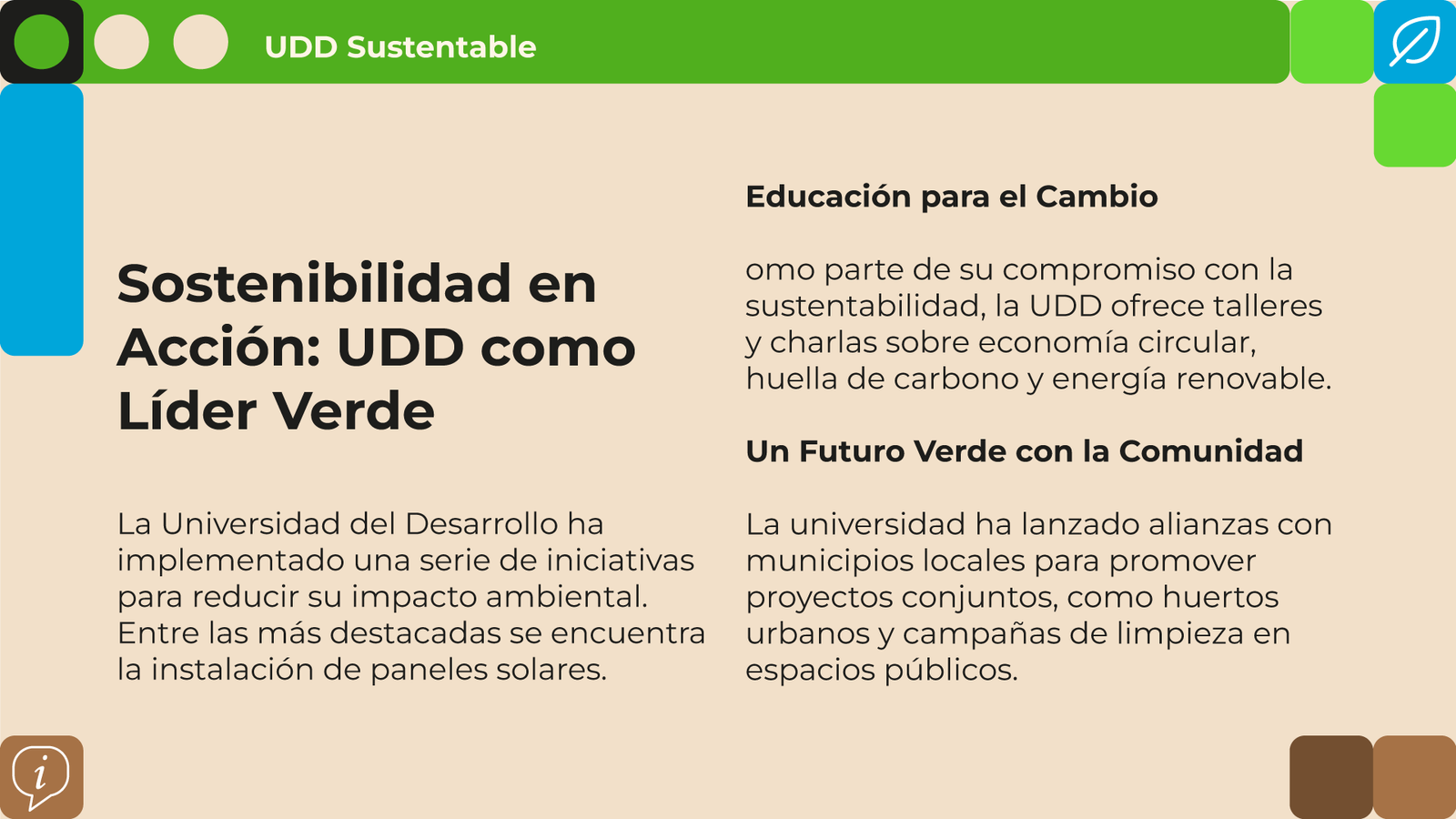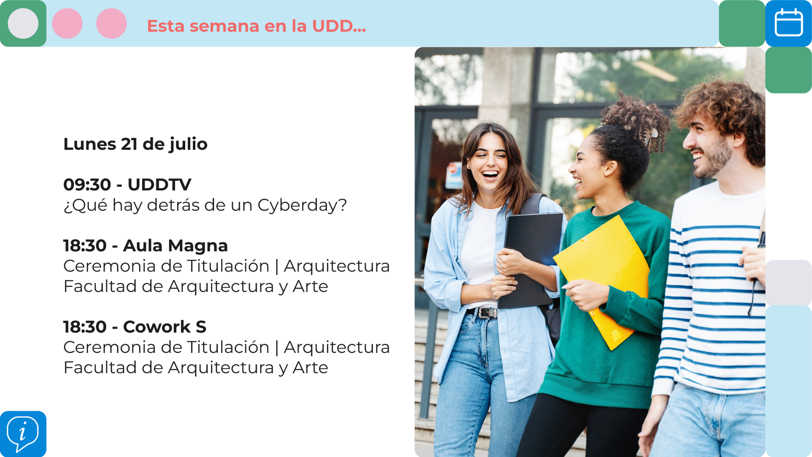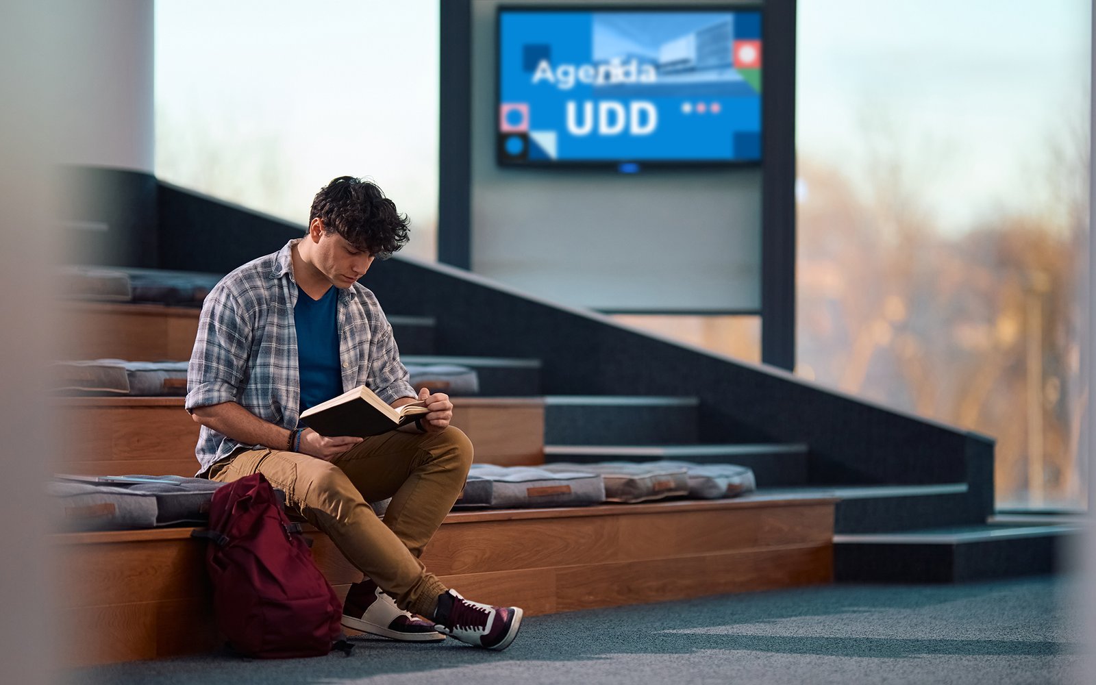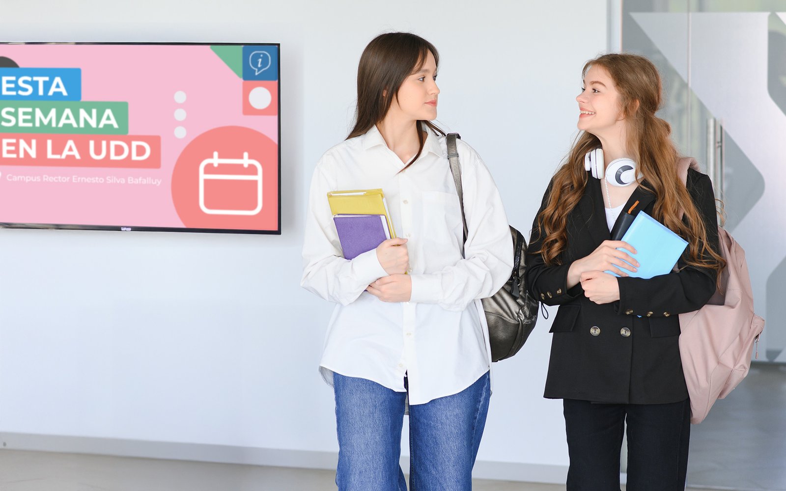 In 2024, the Universidad del Desarrollo (UDD) initiated a project to modernize how information was displayed on screens across its main campus. The Communications Department proposed a structure based on thematic sections to organize the content effectively, encompassing news, events, and other essential information for the university community. To bring this vision to life, the project required the creation of dynamic headers and animated content containers, tailored to each section.